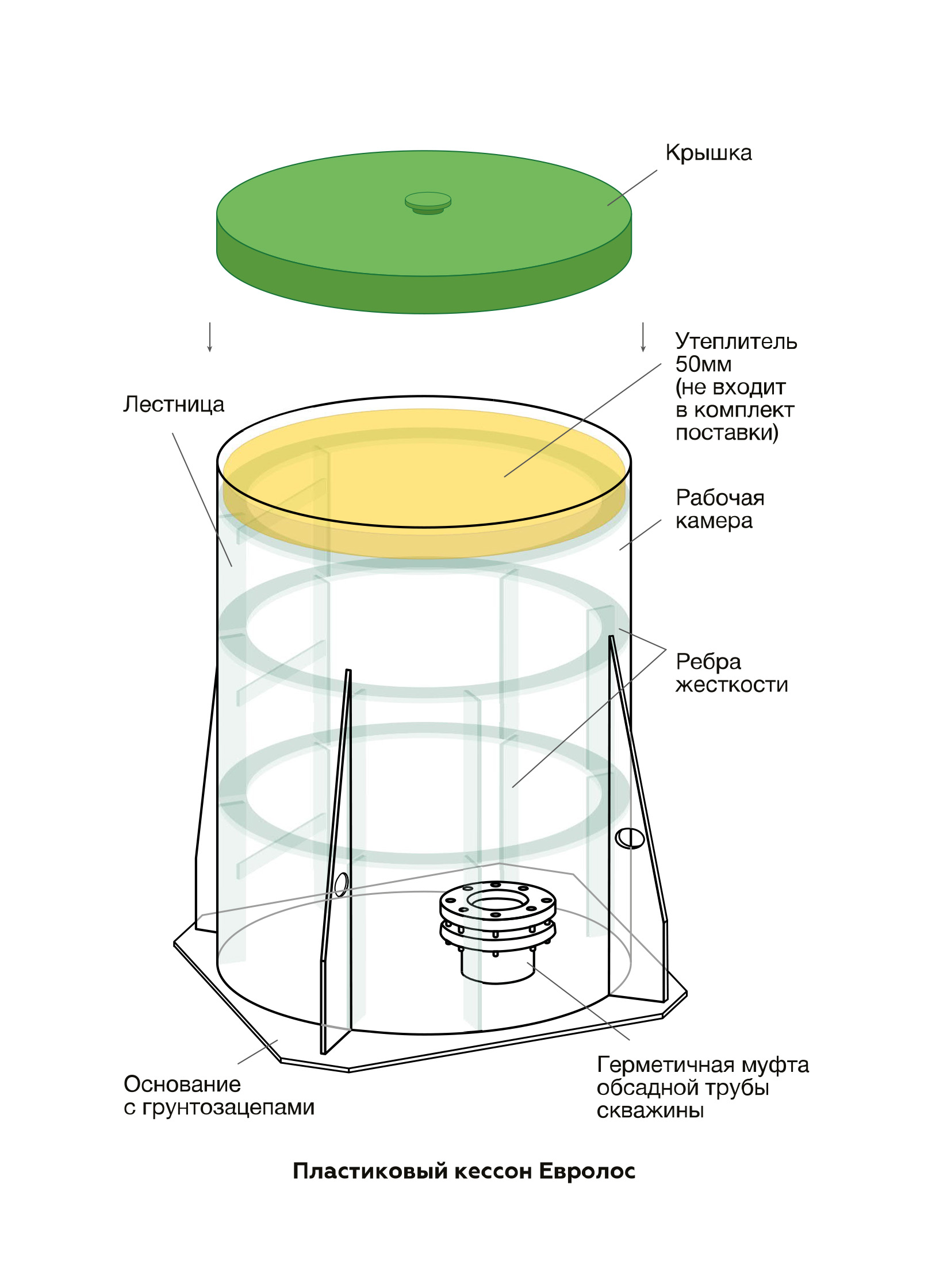 Конструкция изготовлена из монолитного полипропилена толщиной 8 мм, с усилением дна ячеистой полипропиленовой плитой толщиной 80 мм. Кессон имеет герметичную пластиковую конструкцию с ребрами жесткости, встроенной лестницей и крышкой. Его основание снабжено грунтозацепами. В зависимости от своего назначения кессон может быть дополнительно оснащен муфтой обсадной трубы, которая обеспечивает герметичное соединение со скважиной. При использовании изделия в качестве дополнения, например к колодцу, внутри может размещаться: насосное оборудование, фильтры, гидроаккумулятор, запорная арматура, а также разведение трубопровода в разных направлениях, что позволяет сократить затраты на подключение дополнительных потребителей.