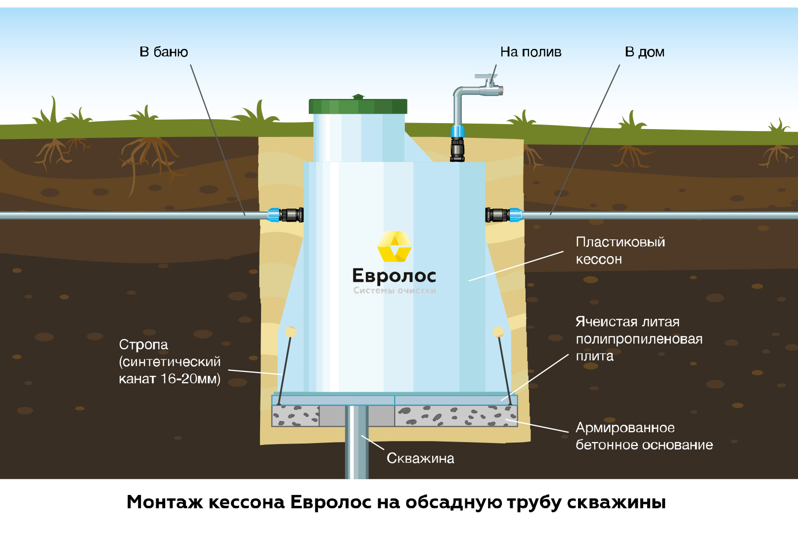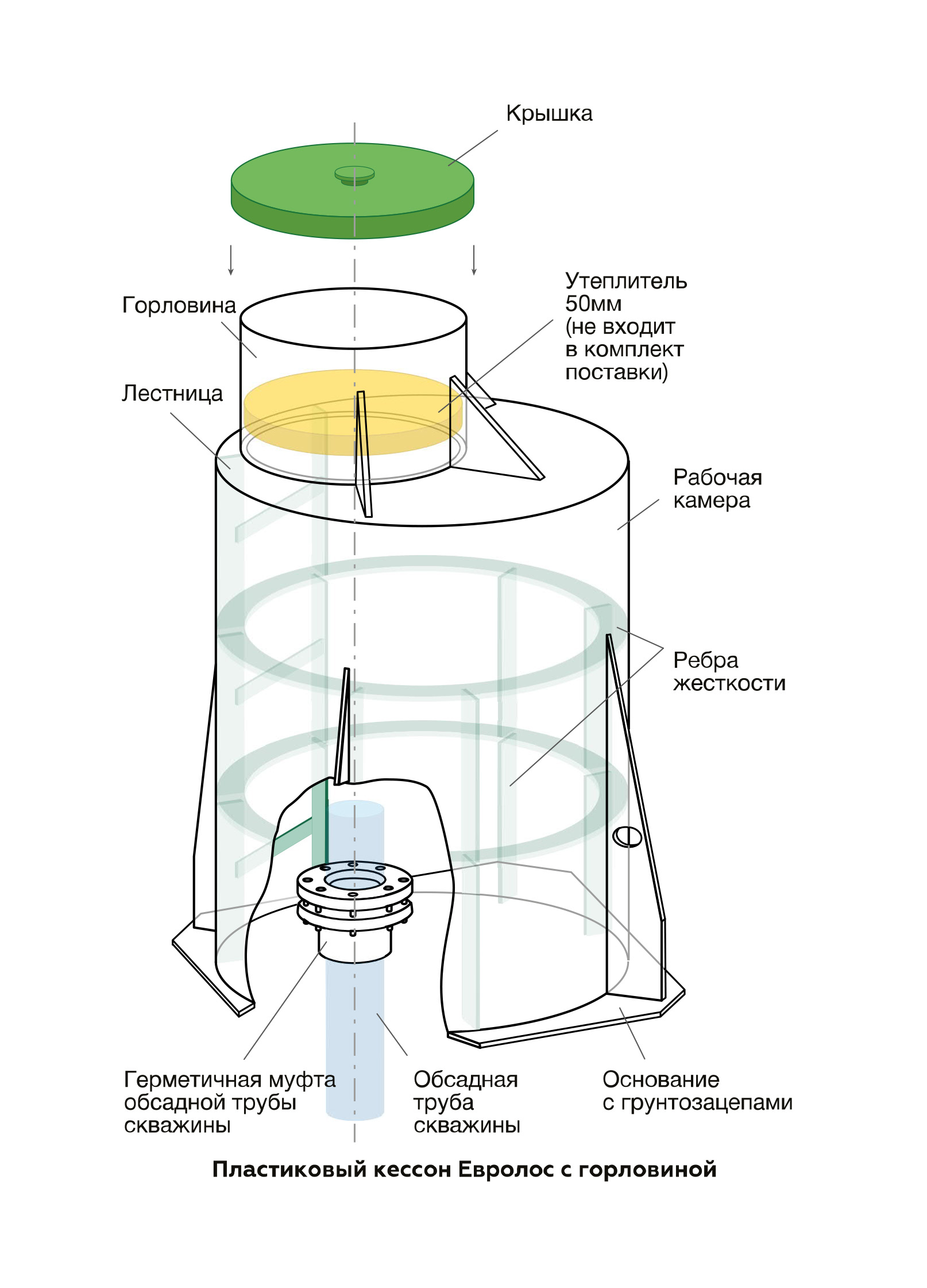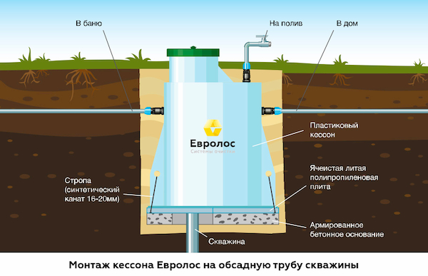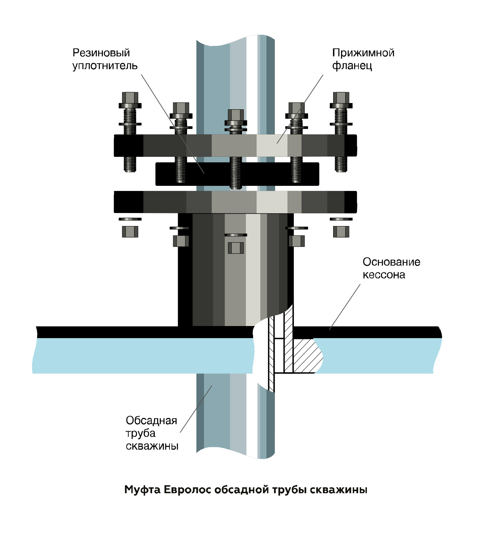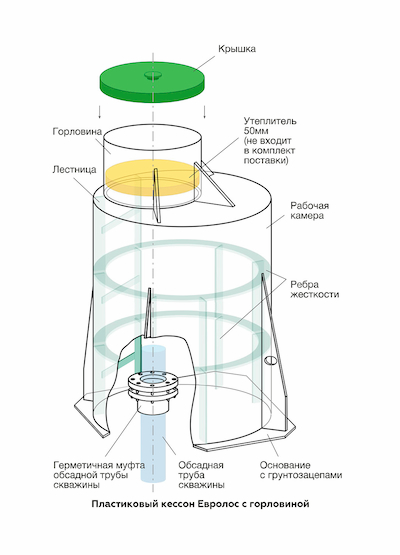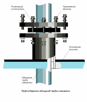 • Обсадная труба скважины. Герметизация соединения кессона с обсадной трубой скважины производится с помощью герметичной муфты Евролос.