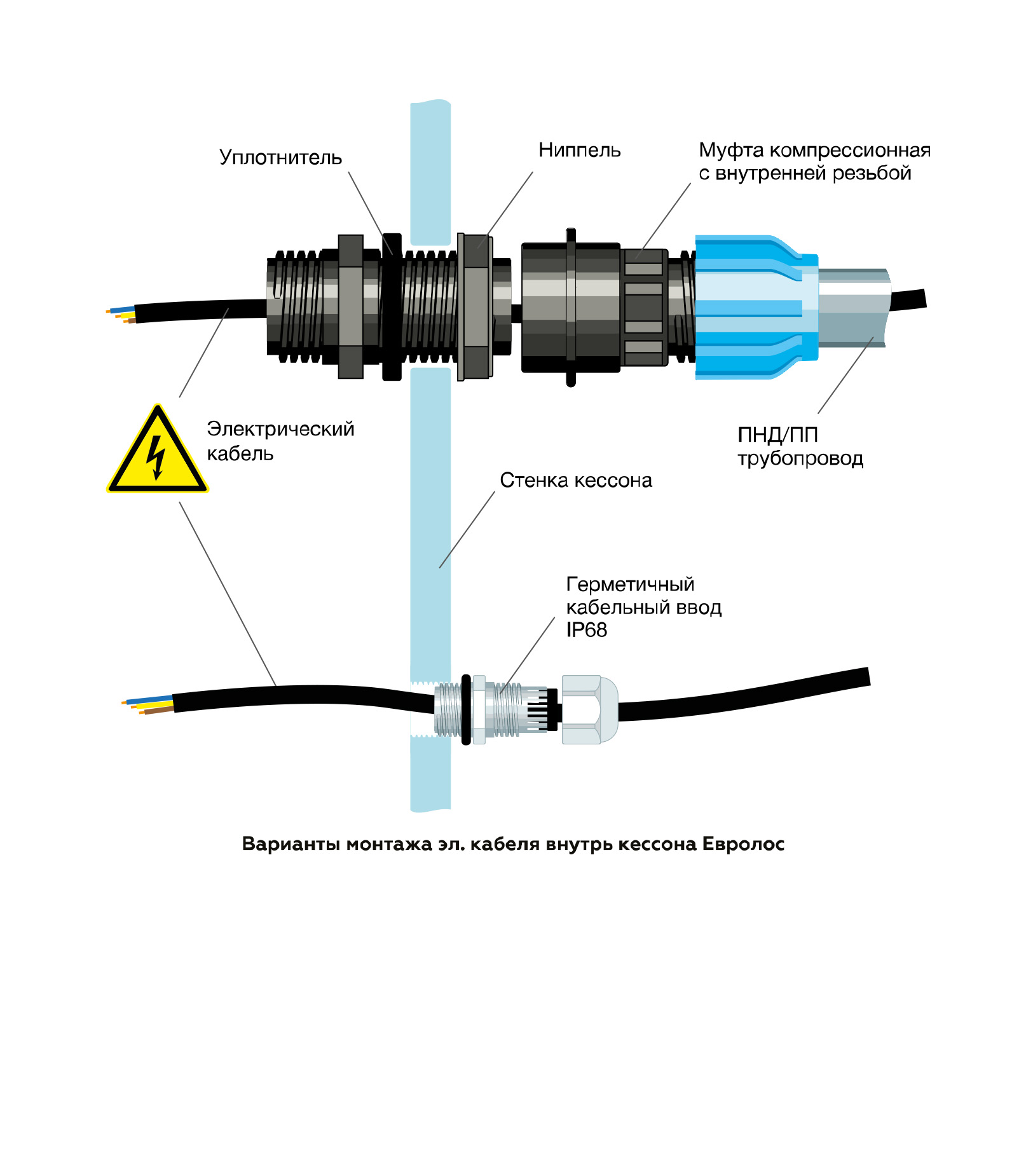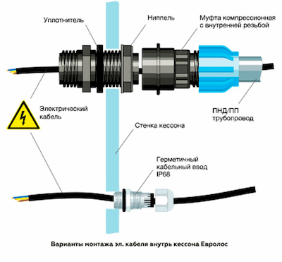 • Электрический кабель. Ввод/вывод кабеля производится через герметичный кабельный ввод либо через односторонний монтажный комплект Евролос.