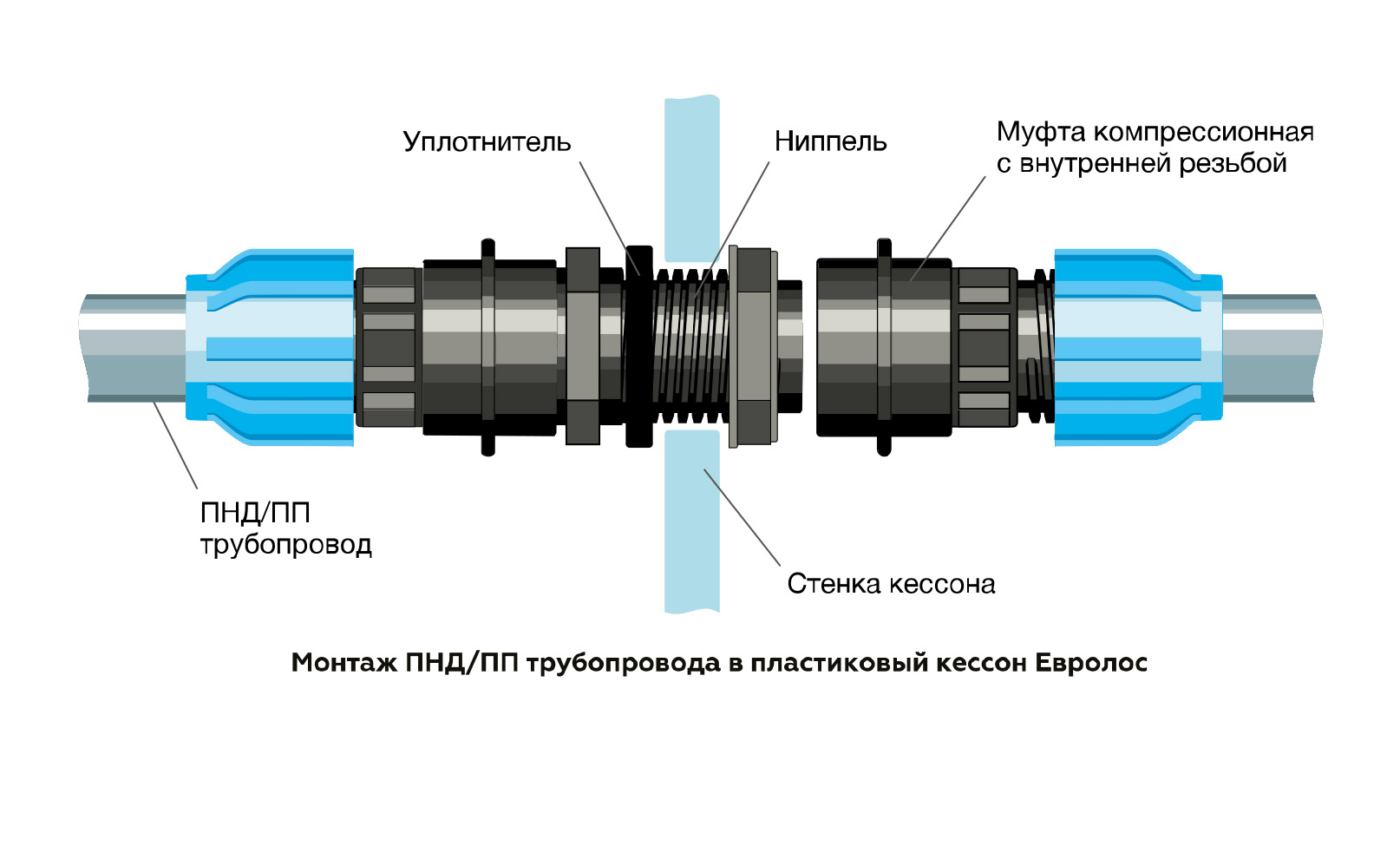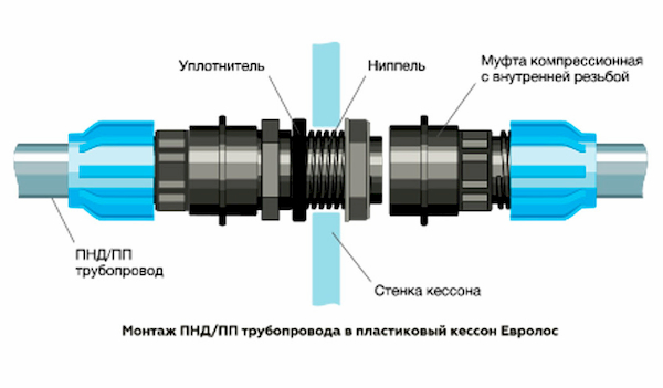 • Магистраль водоснабжения. Герметизация ввода/вывода магистрали водоснабжения производится с помощью монтажного комплекта Евролос, который состоит из набора трубопроводной арматуры и компрессионных муфт. Монтажные комплект позволяет легко подключать как ПП, так и ПНД трубы.